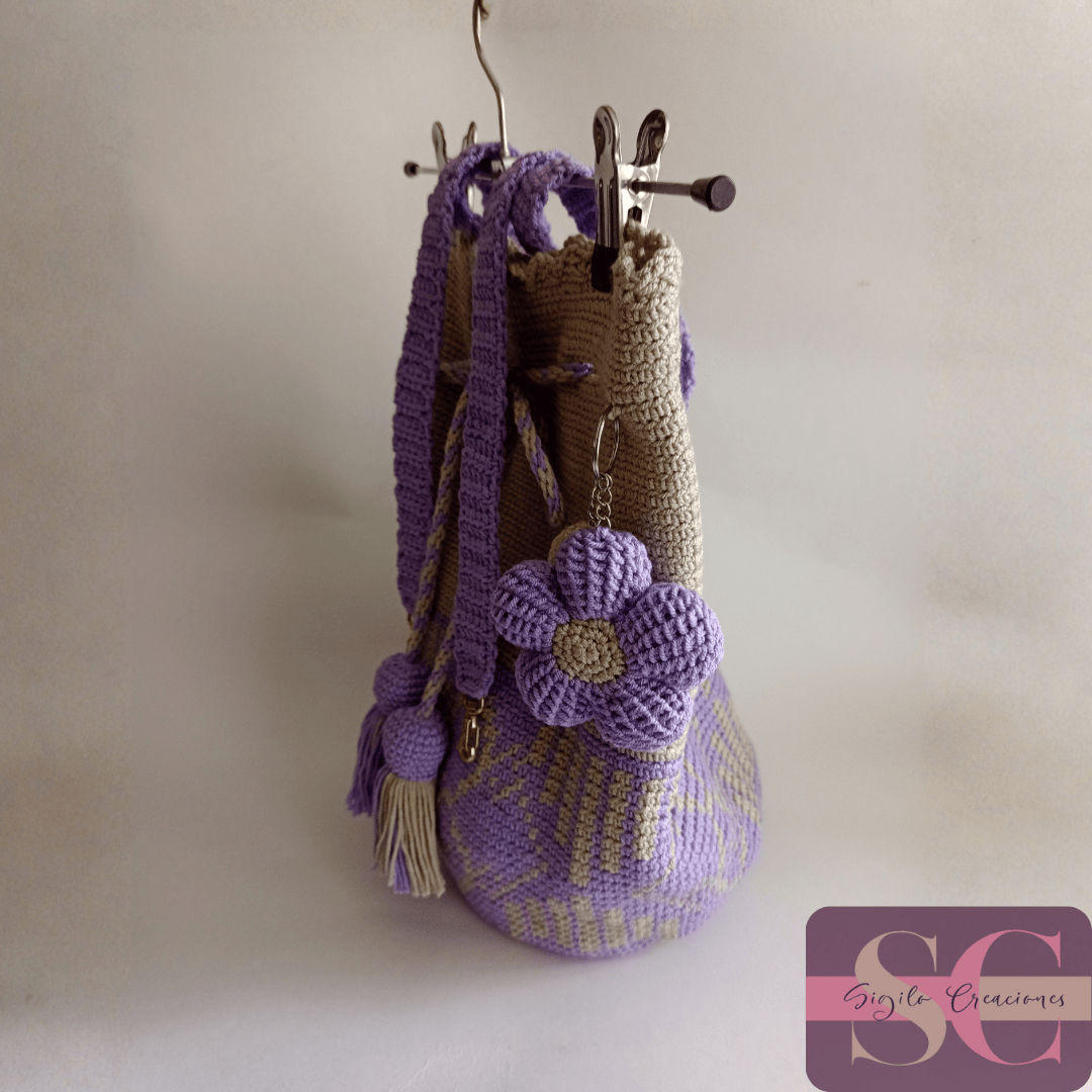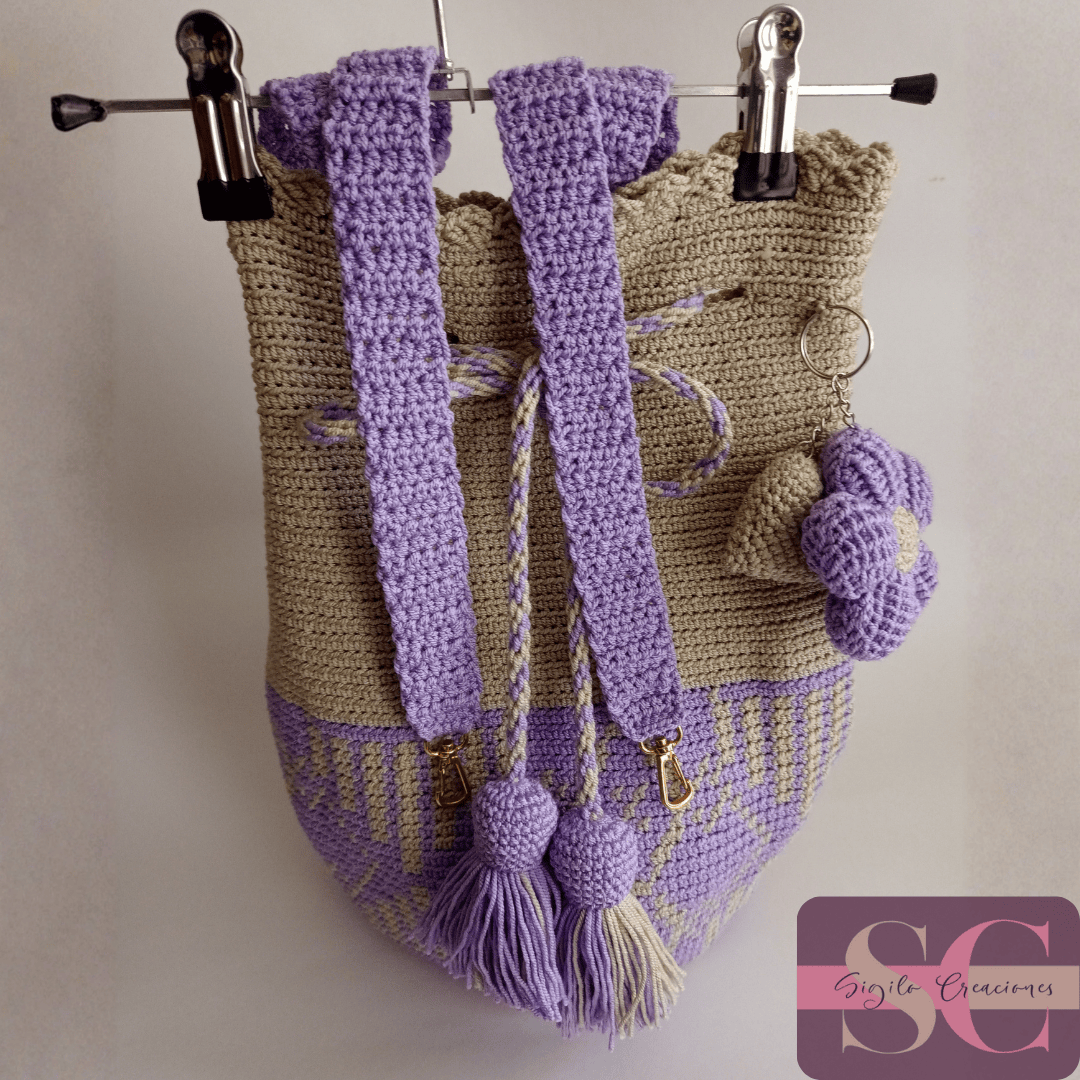 Cada puntada fue tejida con paciencia y sensibilidad, dando forma a una mochila que acompaña de manera delicada y protectora. Los detalles tejidos y su pequeño amuleto refuerzan la energía de cuidado y contención, recordando que la calma también puede ser un refugio.