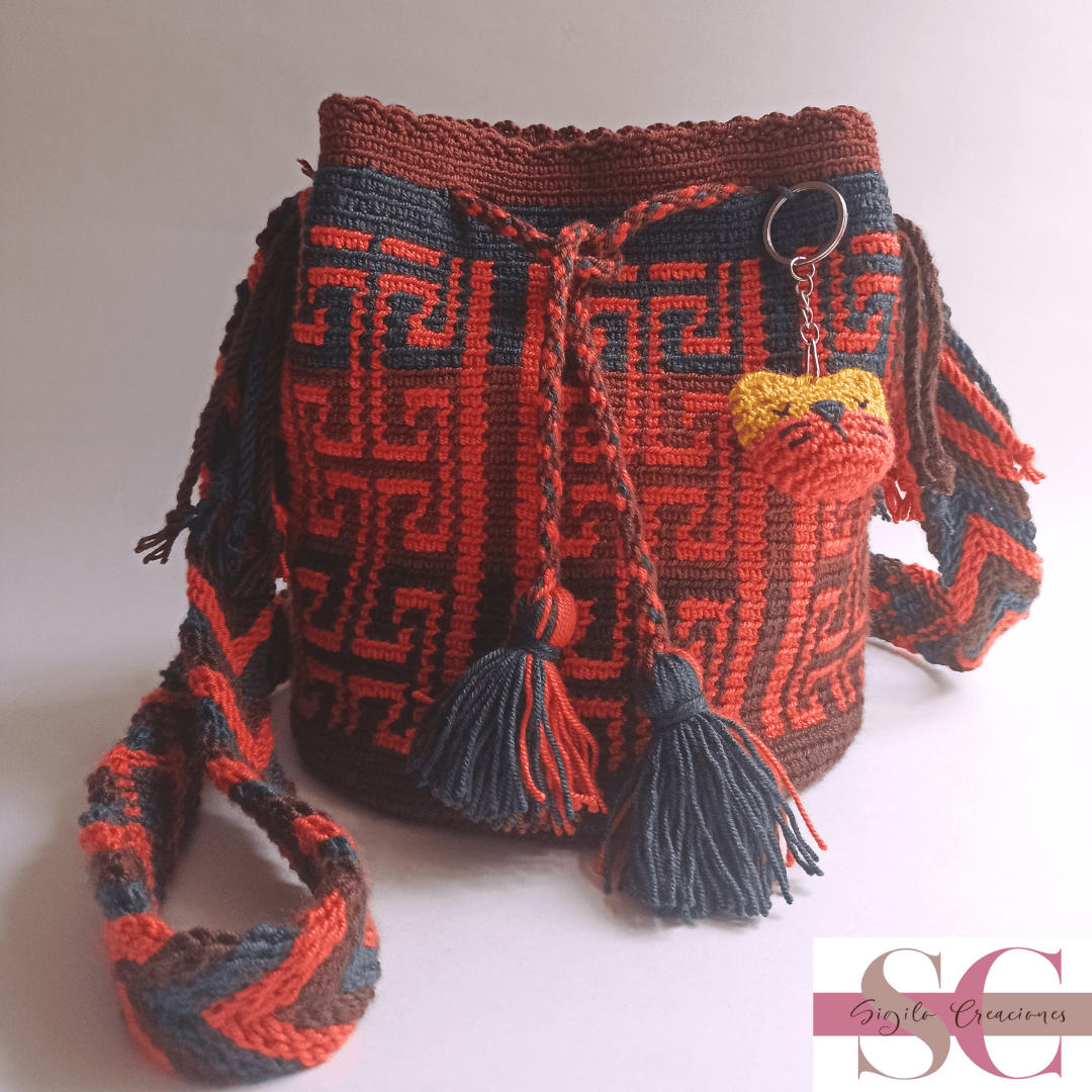 Fuego Ancestral es una mochila tejida a crochet con técnica wayuu, que honra la fuerza primigenia que habita en la raíz y en la memoria del tejido.